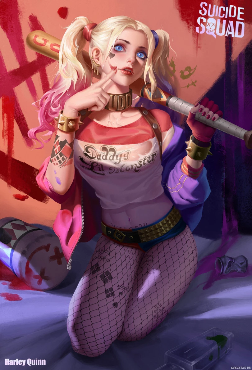 blonde hair styled in two ponytails on either side of her head. In one hand, she's holding what appears to be a bat, which is a signature weapon for the character, and in her other hand, she has