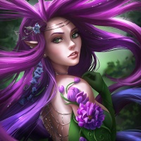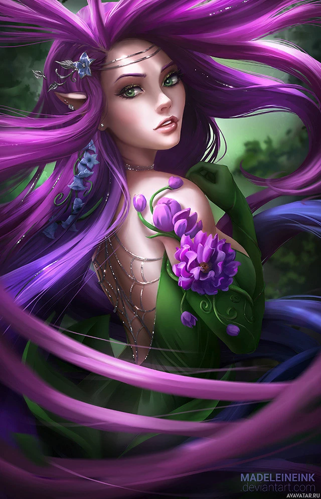 purple hair and is adorned with what seems to be magical or mystical elements, such as flowers in their hair and perhaps some sort of tattoo or mark on their shoulder area. This character could be from a story or game set within