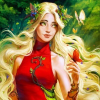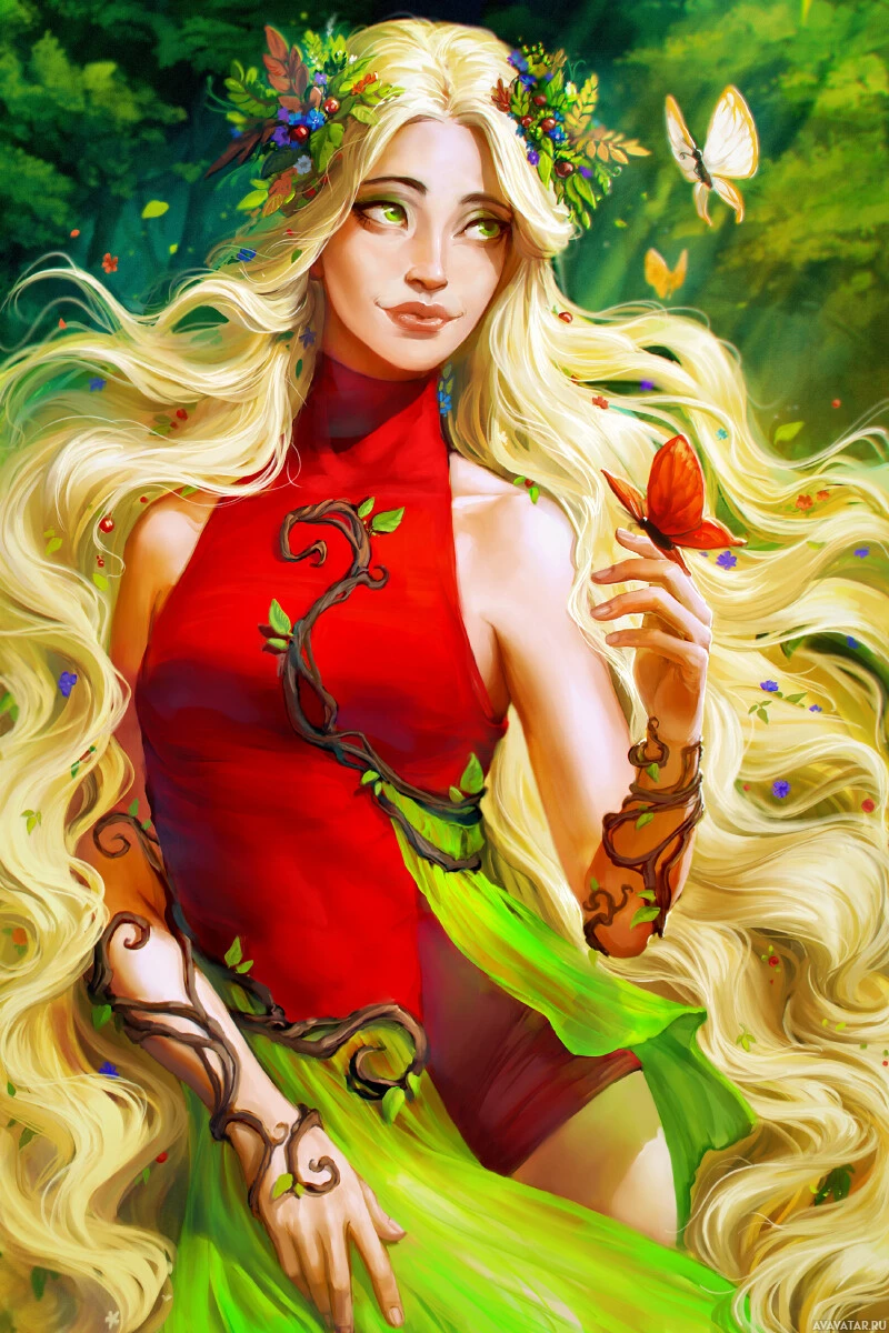 green leaves, and she is holding what appears to be a magical flower or berry close to her chest. The setting seems serene and natural, evoking