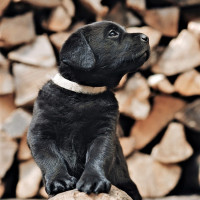 In the picture, there is a black puppy. The dog appears to be sitting on a wooden log and looking upwards with an attentive expression. The background shows stacked pieces of wood, possibly indicating a location where firewood is stored or processed.