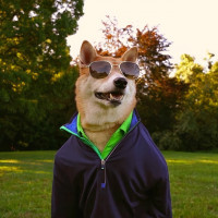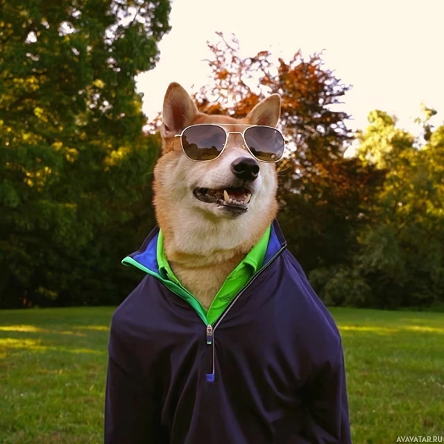 На снимке изображена собака в солнечных очках и синем пиджаке. Собака, кажется, стоит на открытом воздухе, возможно, в парке или поле, с деревьями и зеленью, видимыми на заднем плане под чистым небом. Собака смотрит прямо на камеру и, кажется, позирует для фотографии.