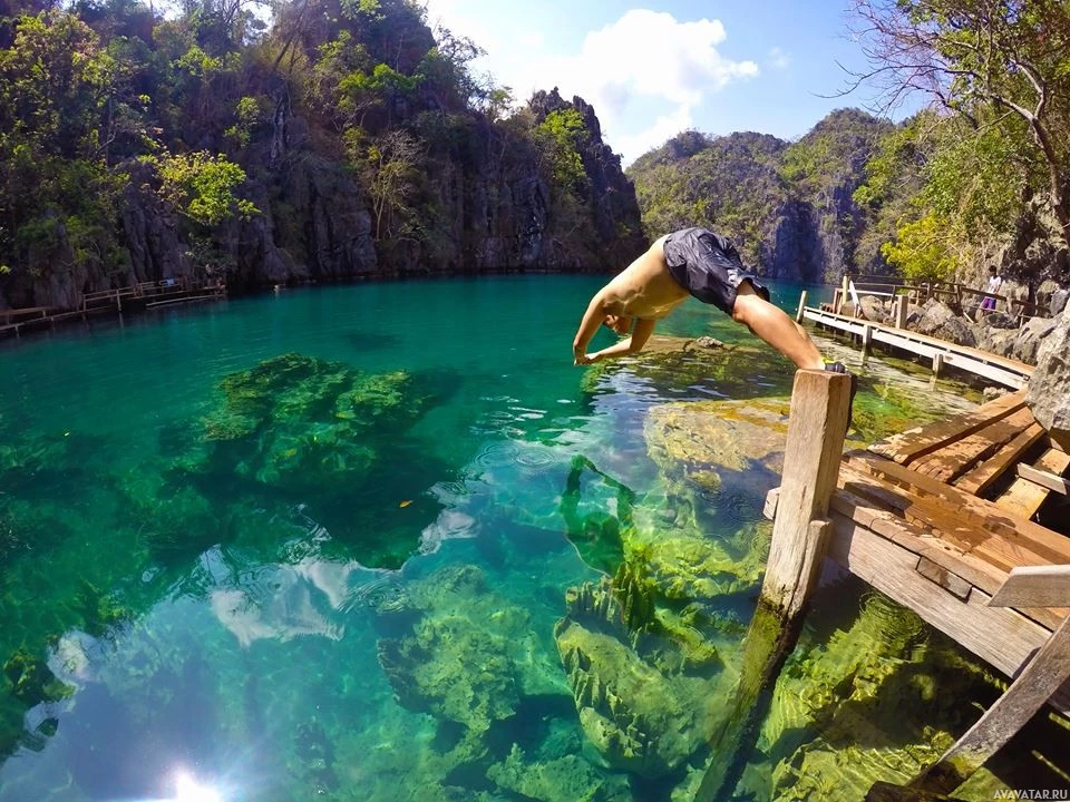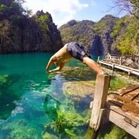 a body of water. The person is in mid-air, suggesting they are performing a dive or jump into the water. In the background, there's a structure that could be part of a dock or pier extending out over the water. The environment appears to be natural and scenic, with vegetation and possibly limestone cliffs surrounding the water, which is blue-green in color.