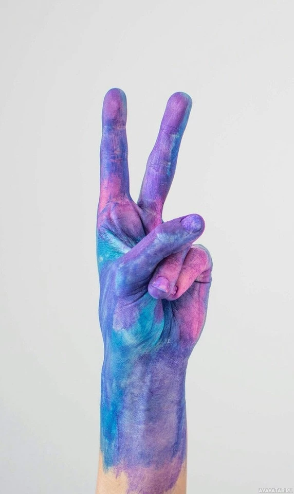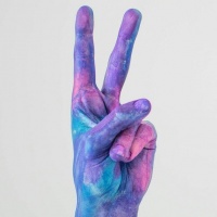 colorful paint or dye, giving the appearance that the hand is "painted" in various hues such as blue, green, yellow, and purple. There's also some colored substance on