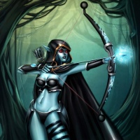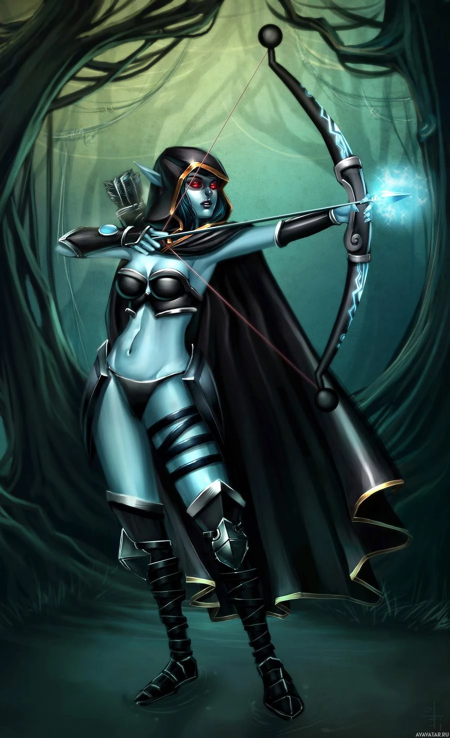 fantasy character in an archery pose. She is holding a bow and appears to be aiming or shooting at something off-frame. Her attire includes a black cloak, armor pieces that suggest she may be from