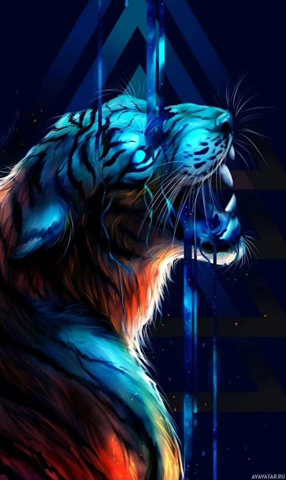 vibrant colors and a dynamic, almost three-dimensional effect that gives it a sense of depth. It appears to be roaring or growling, as suggested by