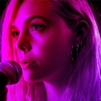 The image shows a person, specifically a young woman with blonde hair. She appears to be singing into a microphone, and the background is tinted in shades of purple or pink. There's a sense that she might be performing or recording music, given her focused expression on the microphone.