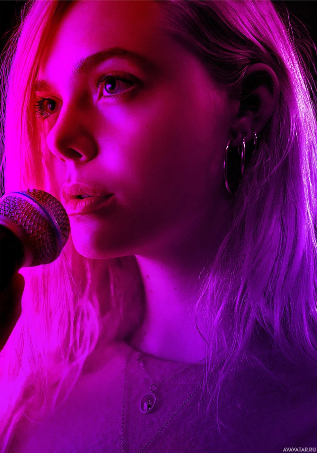 На картинке изображен человек, а именно молодая женщина со светлыми волосами. Она, кажется, поет в микрофон, а фон окрашен в оттенки фиолетового или розового. Есть ощущение, что она может исполнять или записывать музыку, учитывая ее сосредоточенное выражение на микрофоне.