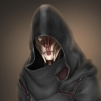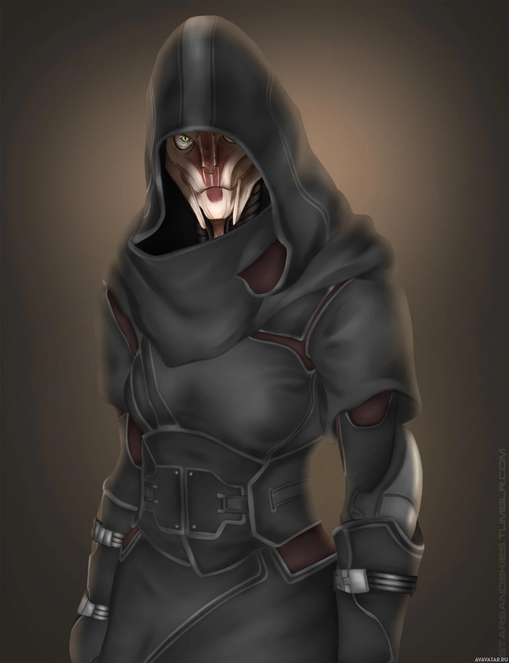 a female character dressed in a hooded cloak, reminiscent of the style seen in the "Mass Effect" video game series. She has a futuristic and sci-fi appearance, with mechanical parts on her armor suggesting