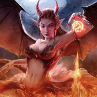 a fantasy character resembling a succubus. The character is shown with horns and wings, typical features associated with succubi in mythology or fantasy genres. She appears to be holding a wand, suggesting she may have