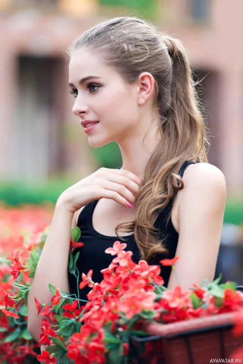 long hair, is wearing what appears to be a black top, and her posture is elegant with her hands resting on the flowers. Her gaze is directed off to one side, giving