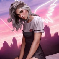 a dark outfit with light-colored accents and has angelic or devilish horns on her head, depending on interpretation. She is sitting on a rooftop ledge at what appears to be either dawn or dusk, given
