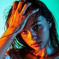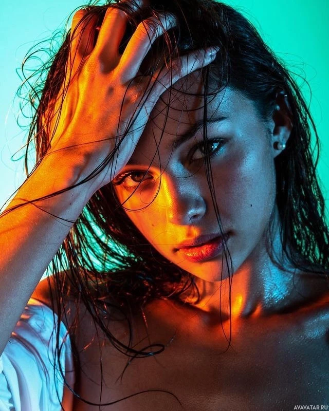 The image shows a young woman with brown hair, captured in a close-up portrait. She has her hand on her forehead and appears to be looking directly at the camera. Her expression is neutral, and she has a glowing background that suggests an artistic or creative setting.