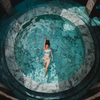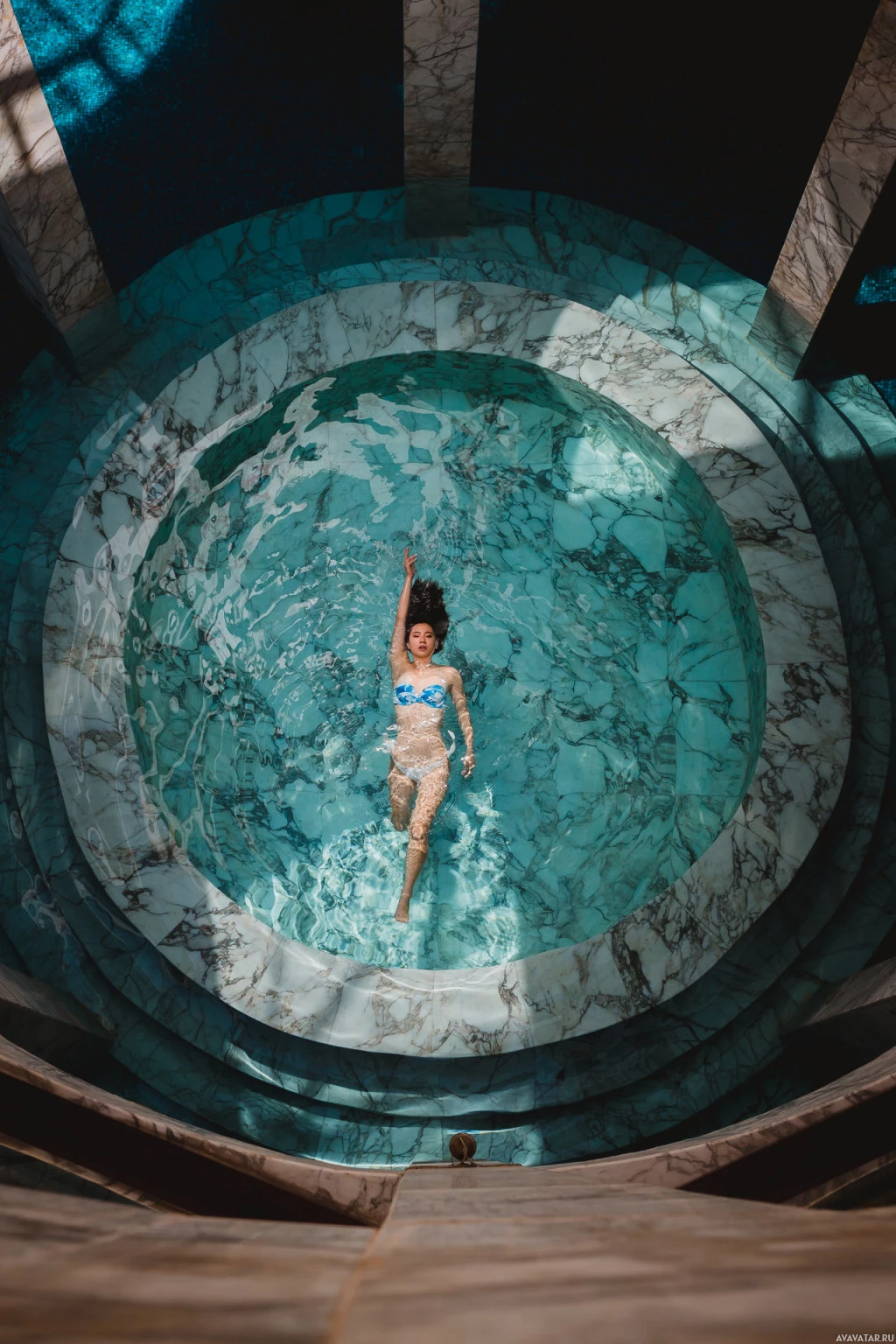 a circular pool. The pool's design is unique, with marble or stone-like walls that give it an elegant appearance. The lighting appears to be natural, possibly from windows not visible in the image, which suggests the setting might be indoors with