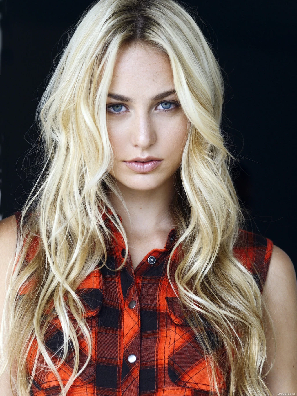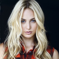 blonde hair. She appears to be wearing a denim-style shirt, and her gaze is directed off to the side. The background is neutral and does not distract from the subject of the photograph. The picture could be associated with fashion, beauty, or modeling contexts given the attire and the style of the image.
