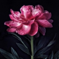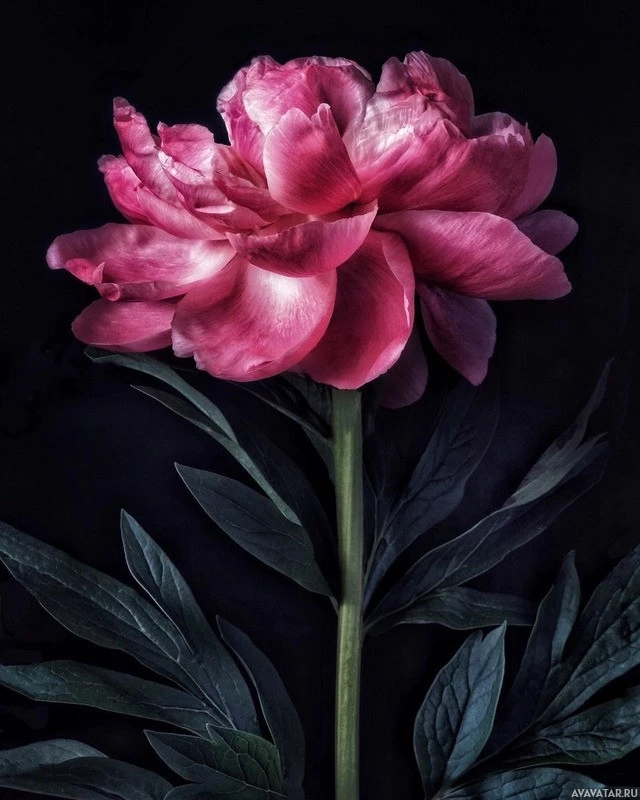 a dark background. The peony is held by its stem and is surrounded by