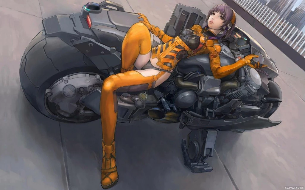 an illustrated character, a girl with futuristic attire and orange accents, sitting on a motorcycle. She is depicted in