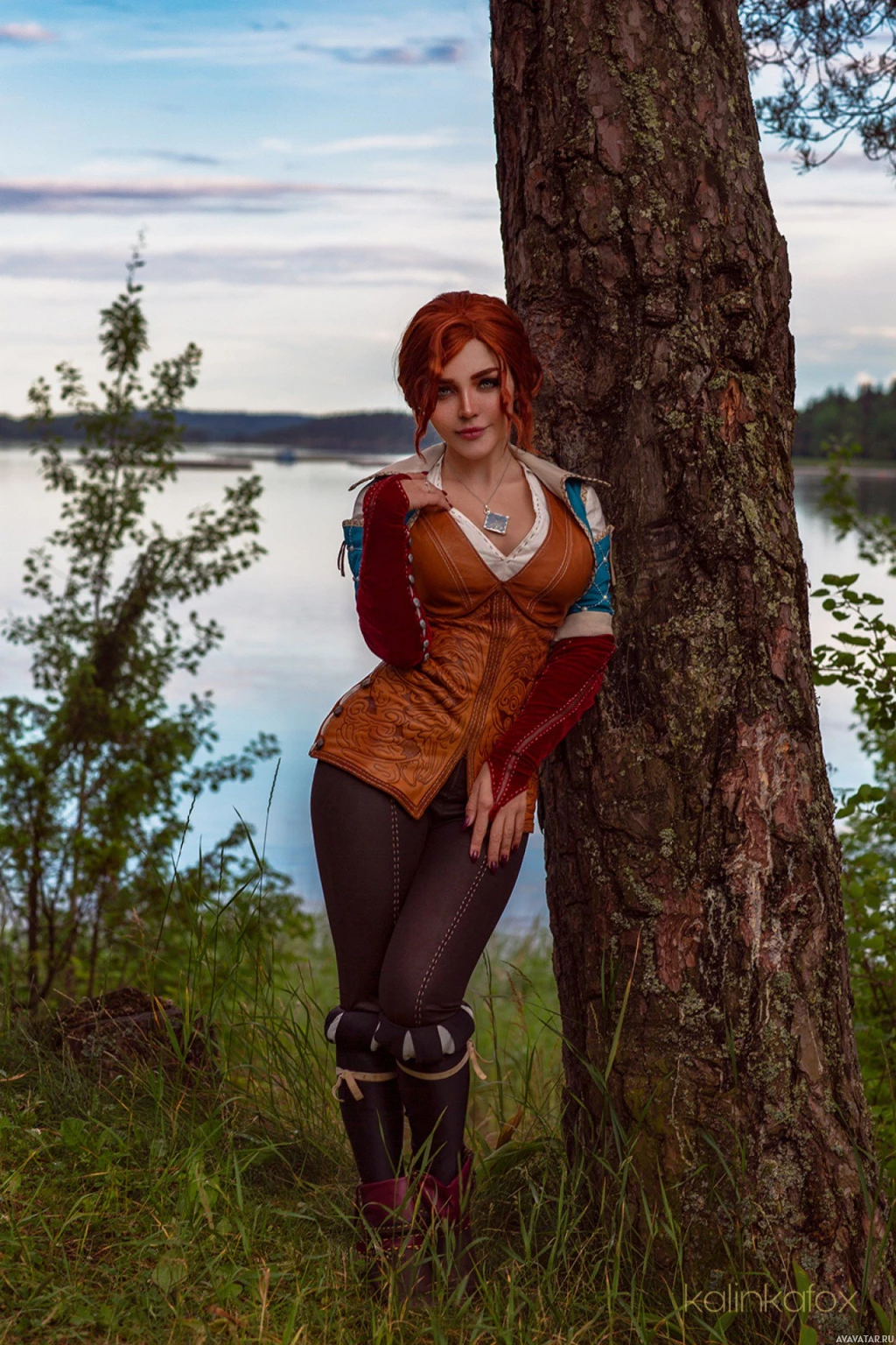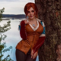 Triss Merigold from "The Witcher" game series. The individual is wearing a costume that resembles armor and has a medieval