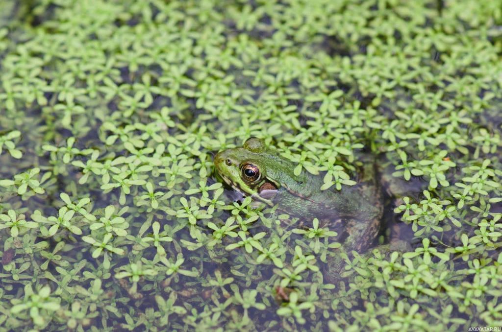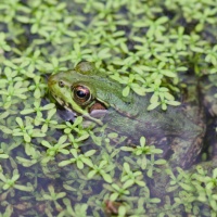The picture shows a frog partially hidden in the vegetation of a pond. The frog is surrounded by submerged