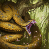 a fantastical scene featuring a large, yellow snake with prominent red eyes. This snake is surrounded by various elements that suggest a jungle or