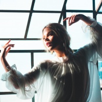 blonde hair and is wearing what looks like a white, flowing garment that could possibly be part of a performance costume or a dress with ruffles. The environment suggests it could be a studio or