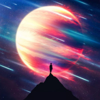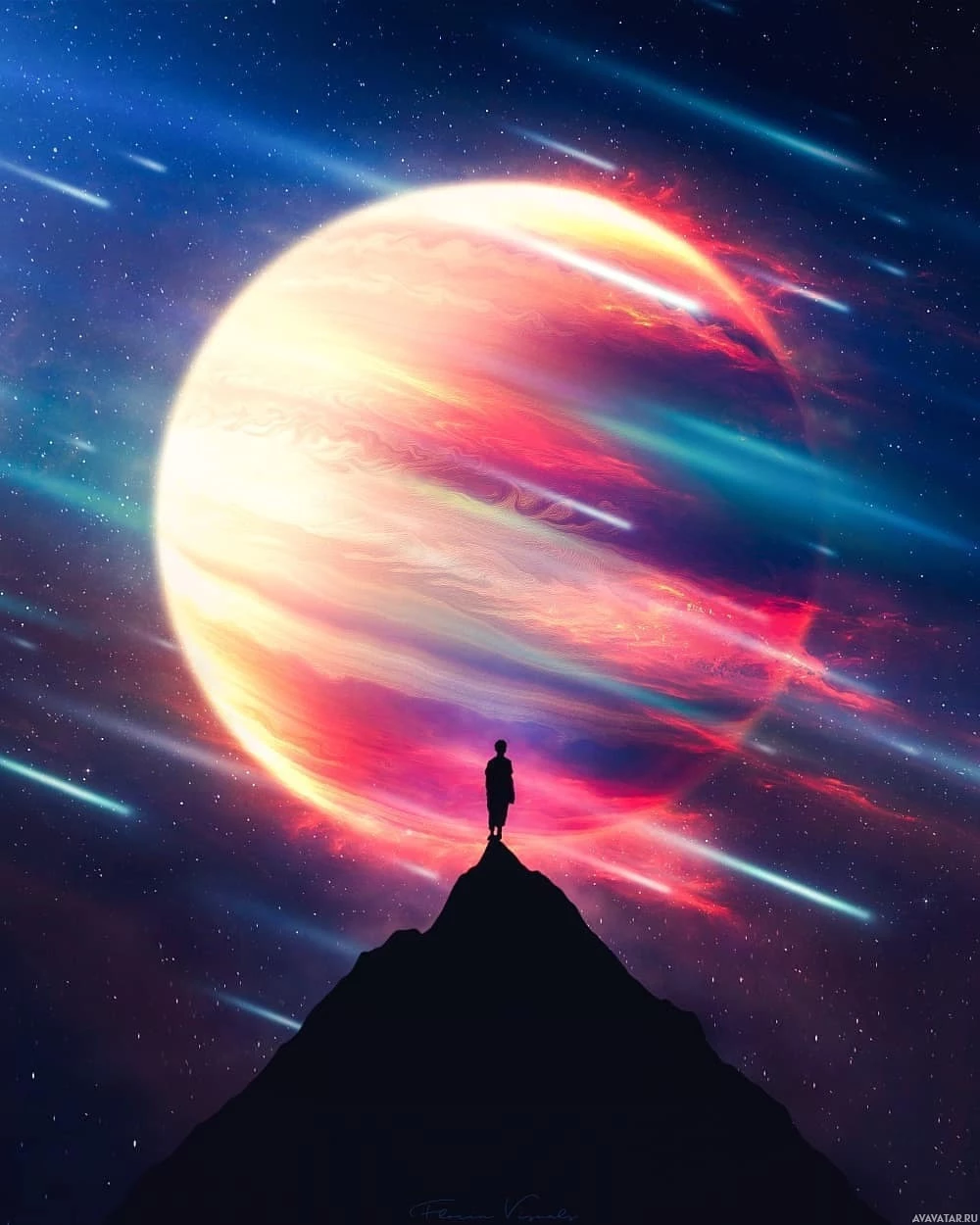 celestial body in the sky appears to be Jupiter, given its distinctive cloud bands and moons. The background is vibrant with stars, nebulae, and streaks that suggest motion or energy. This artwork captures