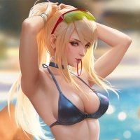 a female figure with blonde hair and wearing a blue bikini. She is posing confidently near the edge of a swimming pool or