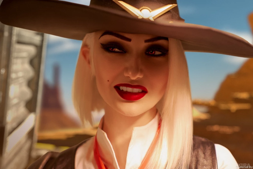 the video game "Overwatch." This individual is wearing an outfit that closely resembles Ashe's appearance in the game. Ashe is known for her long
