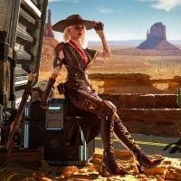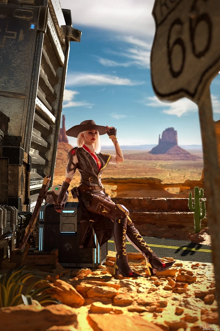 an animated character dressed as Ashe, one of the heroes in "Overwatch." She is posed with a western motif, wearing a cowboy hat and holding a pistol, which aligns with her