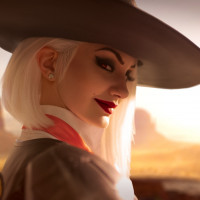 the video game "Overwatch," specifically Ashe, who is one of the heroes in the game. She is depicted standing in a stylized western setting with a sunset or dawn in the background, wearing her signature black and white outfit with