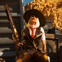 top hat and a cowboy-style vest with bandoliers, along with matching leather pants and boots. She holds a rifle in her hands, ready for action. The setting appears to be