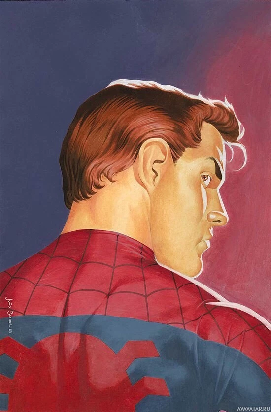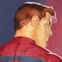 the spider emblem on his chest, and the web pattern on his torso and arms. Spider-Man's face is shown in a contemplative or intense expression, as he gazes to one side. The background has