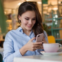 a young woman sitting at a table, smiling and using her smartphone. She is in what appears to be a coffee shop or similar