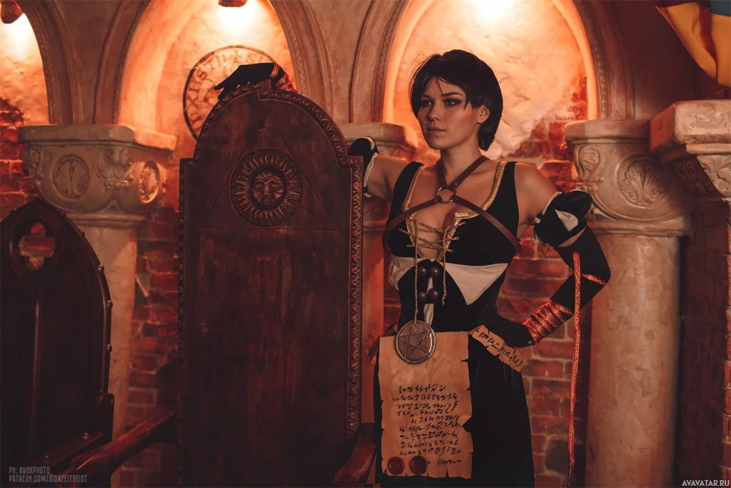 seating arrangement with high backs. She is dressed in cosplay attire reminiscent of The Witcher