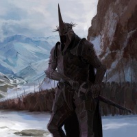 a body of water with snow-covered mountains in the background. The character is wearing armor with distinctive shoulder guards that could be representative of the Witch-king, an antagonist known for his role in the storylines of Middle-earth. This character is portrayed as menacing and powerful, and this image captures that essence well.