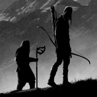 silhouetted figures standing on a hill, likely in Middle-earth. The figure on the left is shorter and holding what appears to be
