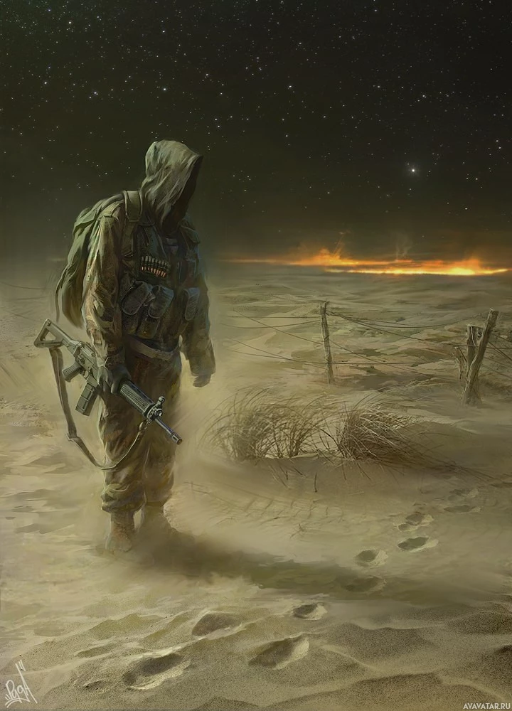 a desolate landscape. The soldier is wearing a helmet with a visor and is carrying a weapon, suggesting he is prepared for combat or on a mission. He appears to be looking off into the distance, possibly observing the surroundings or scanning for