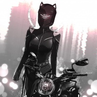 The image depicts a female character wearing a black motorcycle helmet and riding a motorcycle. She is styled with a sleek outfit that could be interpreted as a costume, reminiscent of a superhero or action figure. Her pose suggests motion and confidence while riding the motorcycle. The background is blurred with what appears to be stage lighting, which adds to the dynamic nature of the image.