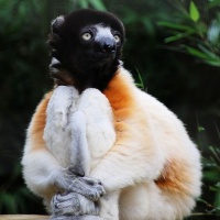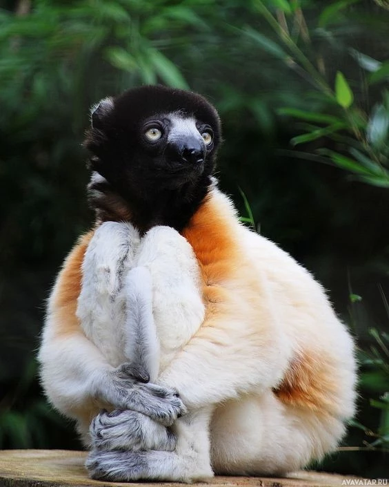 The image shows a primate, specifically an orangutan. It is sitting upright on what appears to be a branch or tree stump with its arms wrapped around itself in a human-like posture. The orangutan's fur has a mix of orange and