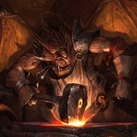 large ears resembling those of a dragon and its skin might have scales. It's holding a hammer and is focused on shaping