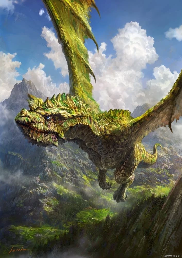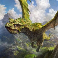 green scales, wings that are spread out wide, and a tail with spiky protrusions. It appears to be flying above a landscape that looks like a mix of real-world elements and fantasy components. This scene is likely from a piece of artwork or an illustration that belongs to