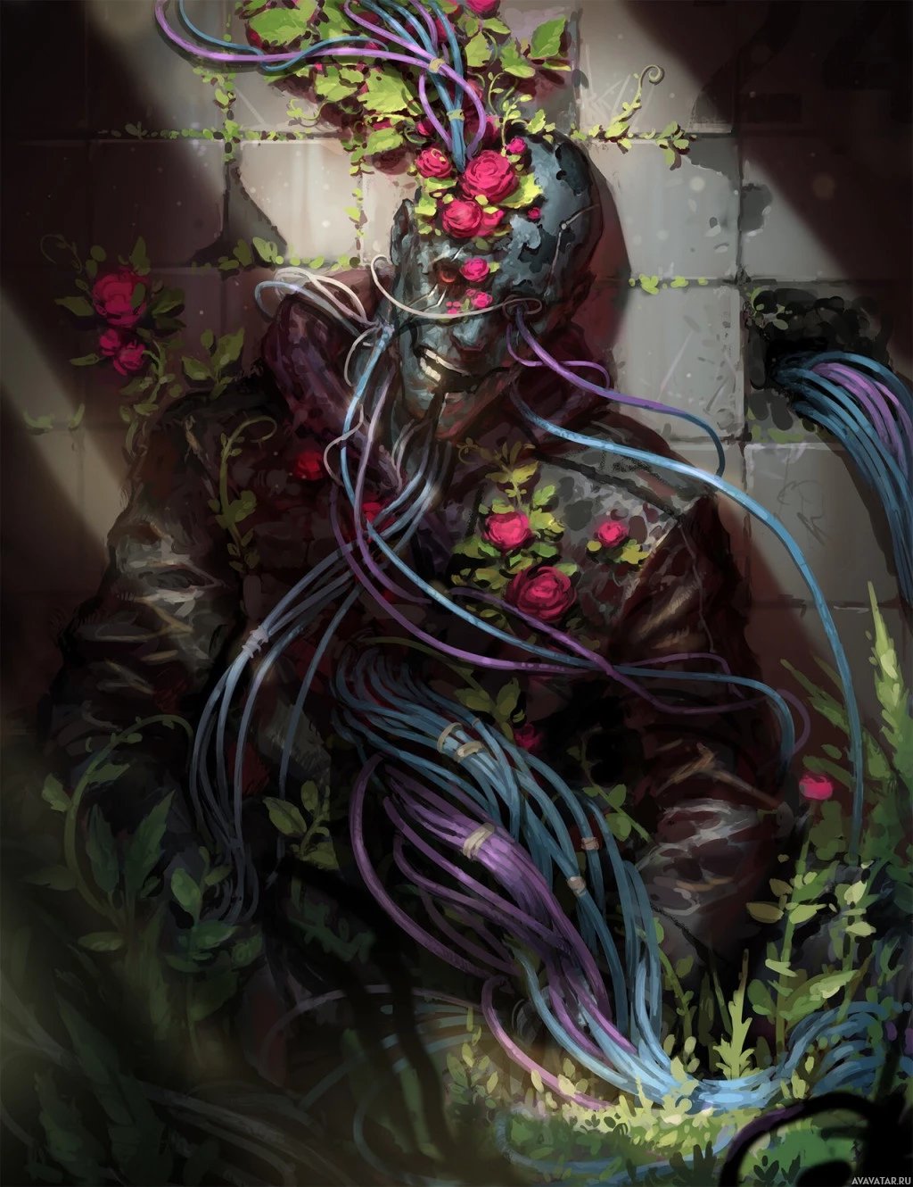 a humanoid figure with metallic parts, such as the head and chest, which are not covered by human skin but instead resemble circuit boards or machinery. The figure has plant-like vines growing out of its back and neck areas, and there is an abundance of
