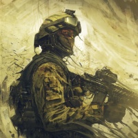 military gear, including a helmet with a visor and goggles. They are holding what appears to be a rifle, ready for combat or training. The background is abstract with