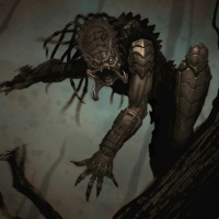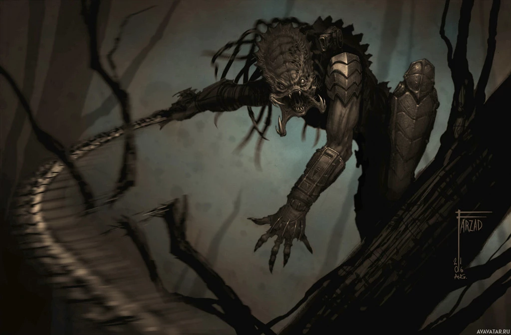 The image shows a stylized illustration of a creature that resembles the Predator from the science fiction horror