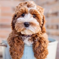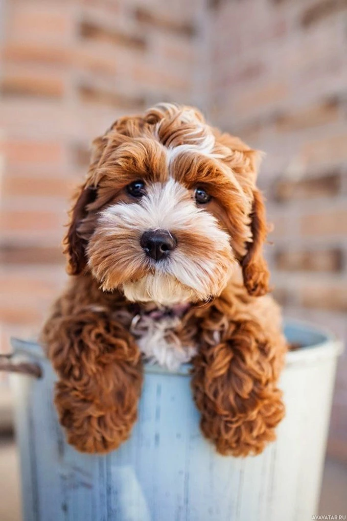 Charles Spaniel, given its facial features and coat texture. The dog is sitting inside a white bucket or tub, which suggests that the photo might have been taken for