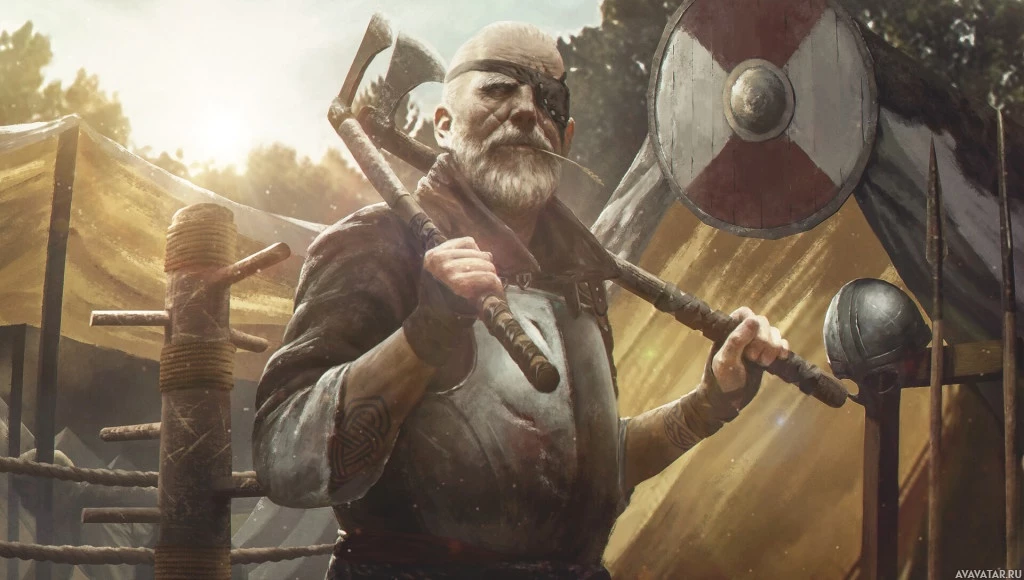 fantasy attire, possibly representing a Norse warrior or a similar archetype. This character is holding an axe with one hand and what looks like a shield or another weapon with the other hand. In the background, there's a structure that resembles a hut or tent, suggesting