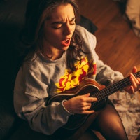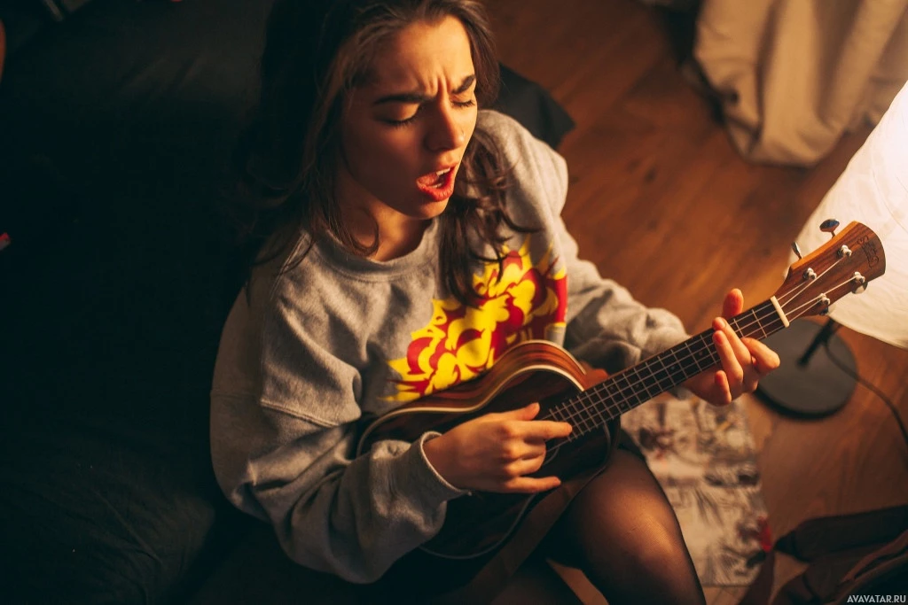 a young woman playing a ukulele. She has her eyes closed, and she seems to be deeply focused on her performance or expression, which might imply that she is passionate about the music or singing. She has