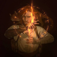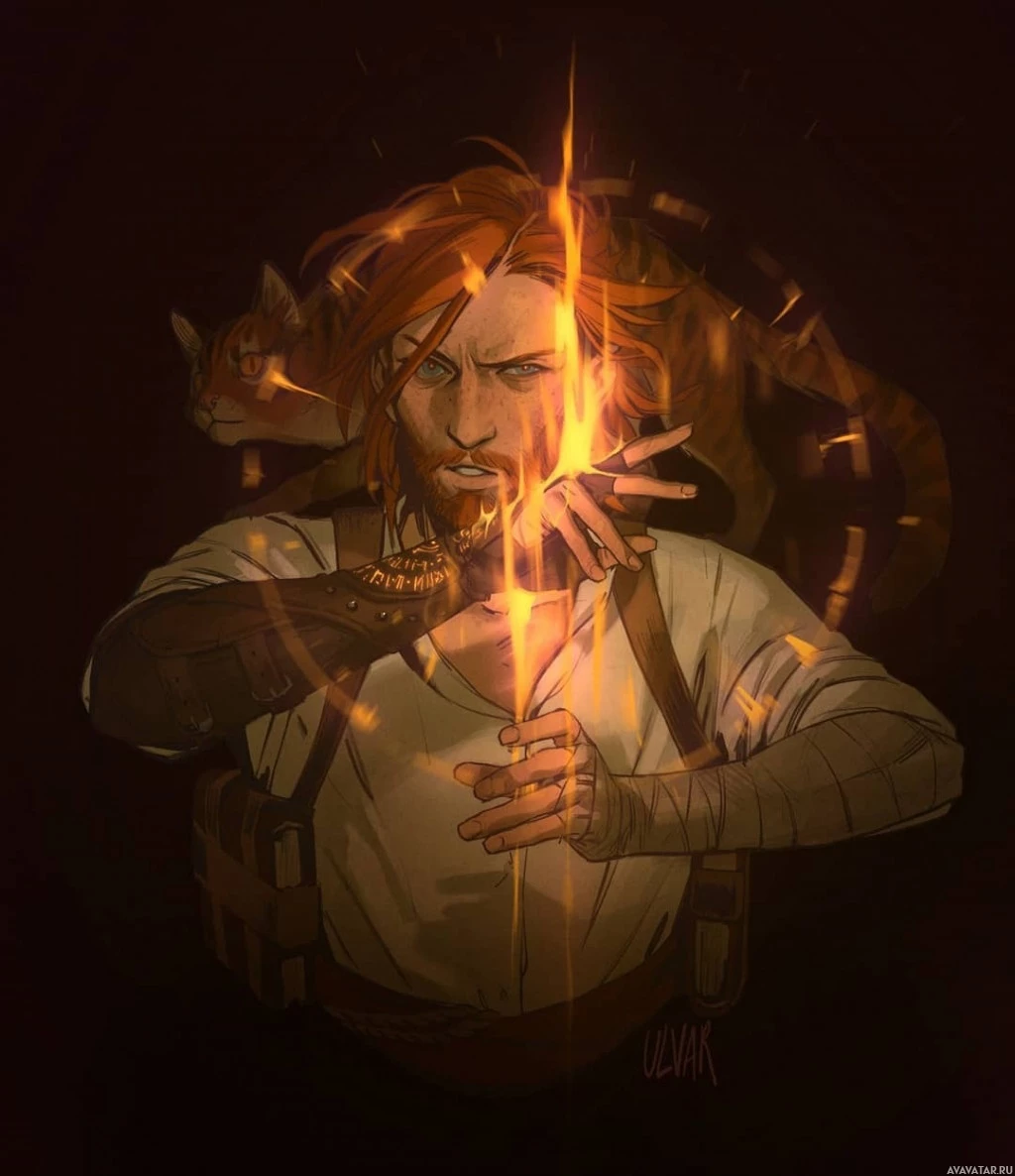 a man with a beard, wearing what appears to be armor or clothing reminiscent of a medieval or fantasy setting. He is holding a staff and has a determined expression on his face. Above his head, there are two magical looking sparks or embers that seem to be emanating from his hands. There is also a cat-like creature with