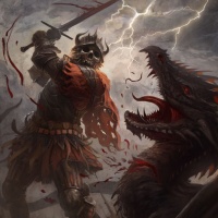 mythical creatures are battling it out. The knight's posture and expression suggest determination and readiness for combat.