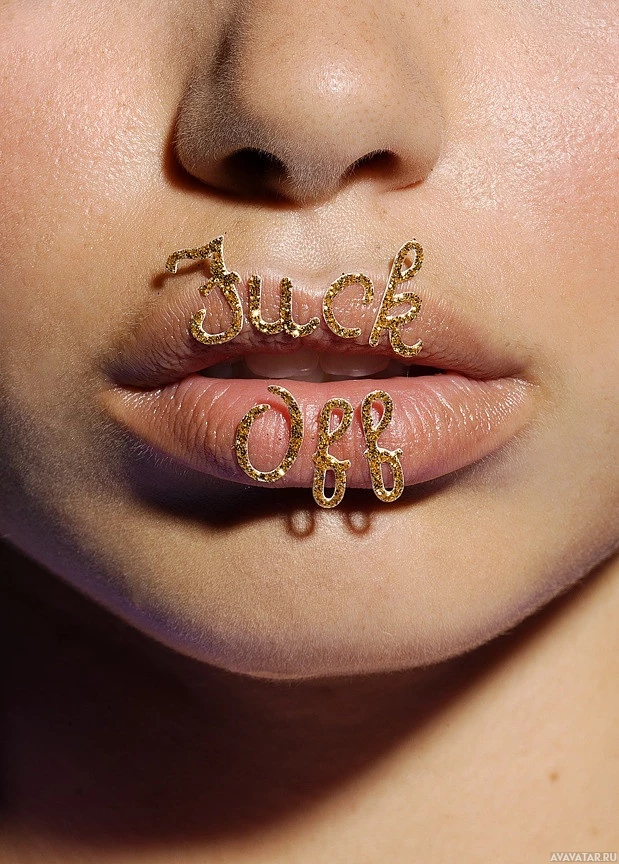 The image shows a close-up of a person's face, focusing on their lips. On the lips, there is a text that reads "Suck my balls". The text is written in a cursive font and appears to be golden or metallic in color, contrasting with the skin