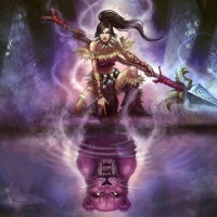 a glowing crystal at the top and also seems to have some kind of bow or arrow-like weapon in her other hand. Her attire suggests she might be a character from